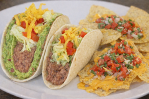 Deux galettes : une souple de blé et une croquante de maïs, guacamole entre les deux et garni de purée d’haricots rouges, salade, pico de gallo, crème fraîche et cheddar râpé. + 1 Taco Soft Veggie accompagné de nachos au cheddar fondu