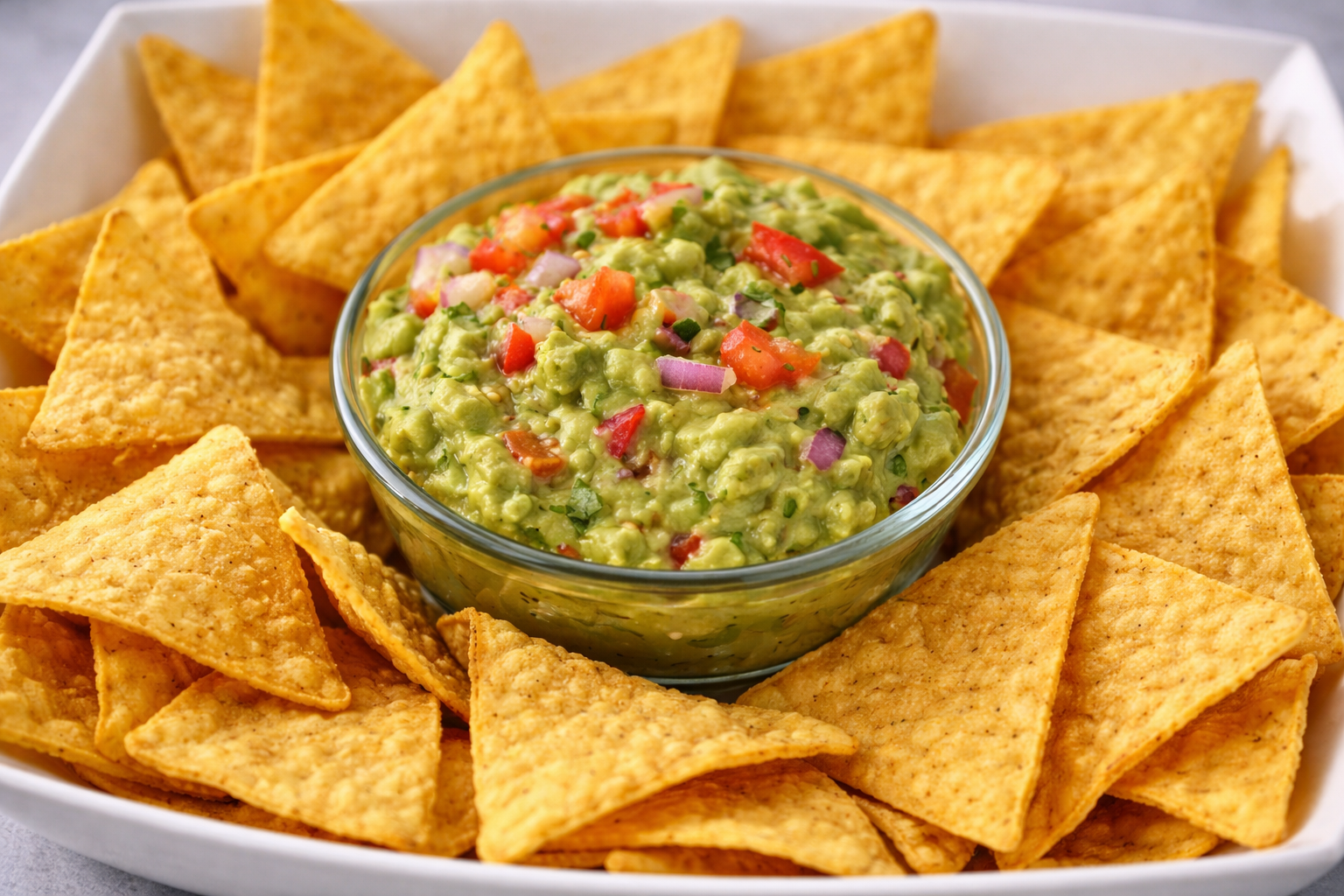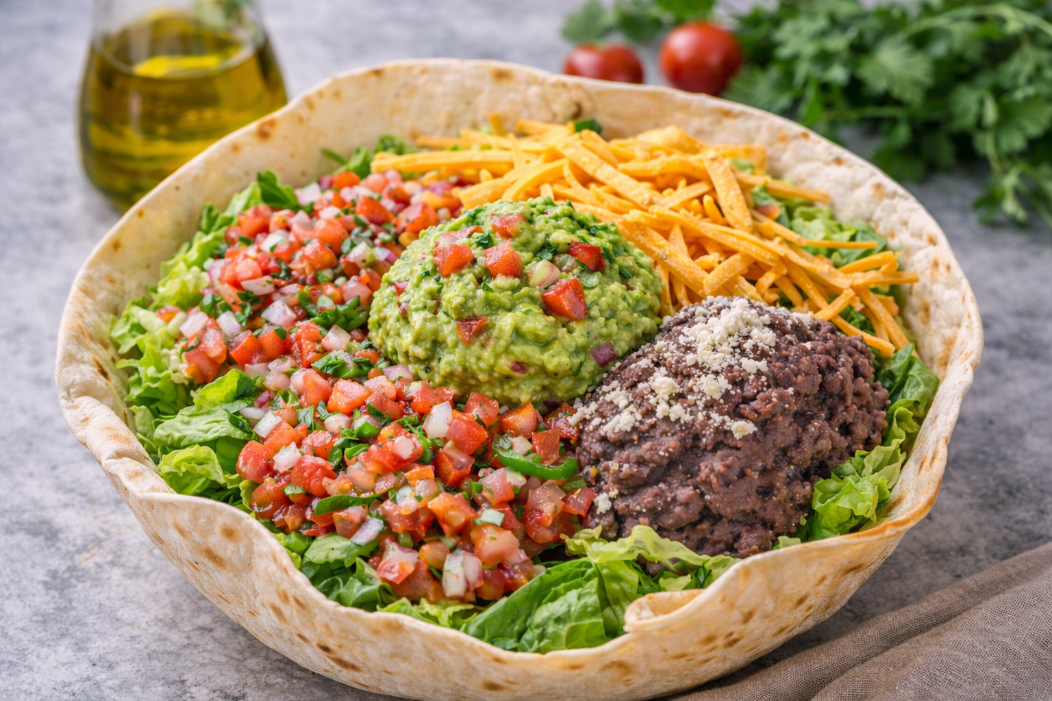 Salade, pico de gallo (mélange de tomate, oignons rouges et coriandre fraîche), guacamole maison servie sur une grande galette de blé, cheddar râpé, purée d’haricots rouges et huile d’olive et nachos